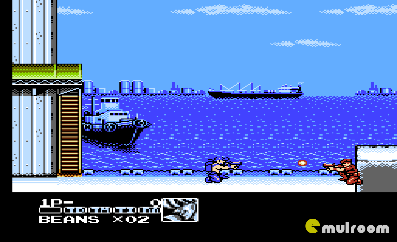 Наоборот, в игре также есть несколько отличий от серии Contra. Усиление оружия достигается за счет накопления в портфеле датчиков, которые появляются из разрушаемых элементов сцены (трубы, ящики и т. Д.). Вместо того, чтобы сражаться с крупными машинными и инопланетными боссами, игрок сражается в основном с человеческими боссами, которые наносят многочисленные удары, чтобы победить.